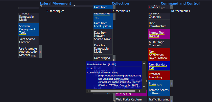 To answer this, we’ll need to navigate back to the Enterprise Layer matrix. Then, apply a "find" filter (Ctrl+F) to search for "Non-Standard Port." We find one result under Command and Control, where the port listed in the matrix is 6789.