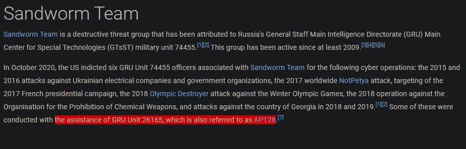 If you recall, there was mention of another group in the Sandworm Team profile introduction. We can find the name of the group in the description: APT28, also famously known as Fancy Bear.