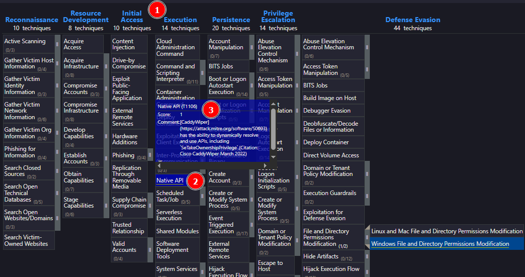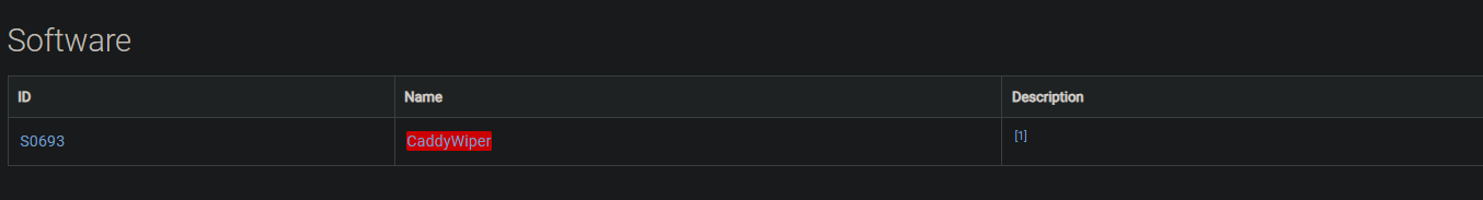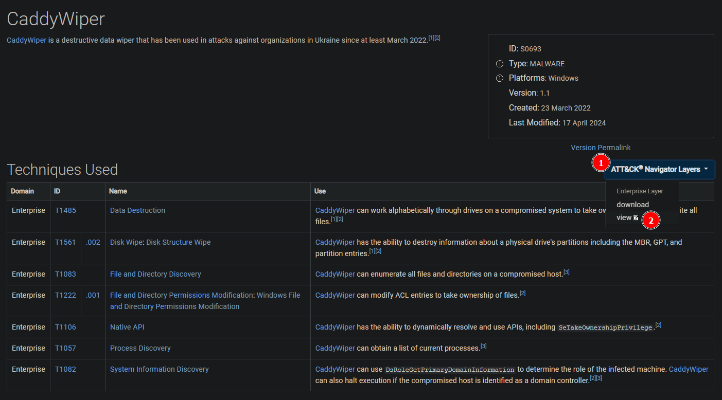 Let’s navigate to the CaddyWiper software page, open the ATT&CK Navigator [1], and view the Enterprise Layer [2].