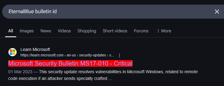 Let’s take this information and perform a Google search for the Bulletin ID for EternalBlue. The first result immediately shows our Bulletin ID.