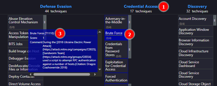 Go to the "Credential Access" tab [1], then look for the highlighted "Brute Force" technique [2]. There, you’ll find the Attack ID [3].
