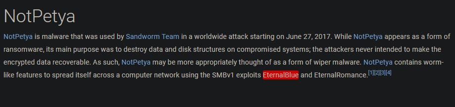 When viewing the NotPetya tool profile on MITRE, we can see that the description mentions the abuse of SMBv1 with EternalBlue.