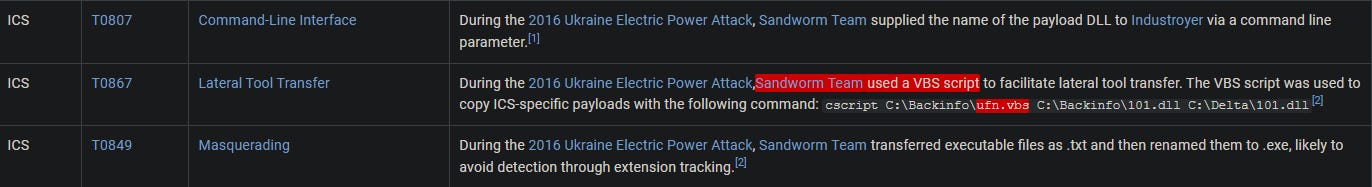 Navigate back to the 2016 Ukraine Electric Power Attack campaign page and search through the techniques used. Look for any mention of the .VBS file—here, we see it listed under the "Lateral Tool Transfer" technique.