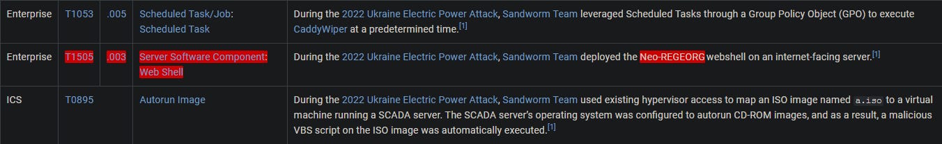 In question 4, we highlighted the sub-technique used, and there we see the deployed “Neo-REGEORG” Web Shell. To confirm this, we can also return to the 2022 Ukraine Electric Power Attack campaign page and find it listed under the Techniques table.
