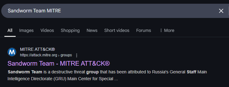 Moving forward, we will primarily use MITRE ATT&CK to answer most of the questions in this Sherlock. Let’s start by performing another Google search for “Sandworm Team MITRE” and navigating to the website.